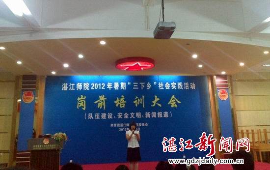 湛江新闻网6月26日讯 6月25日晚,湛江师范学院共青团团委主办“湛师2012暑期三下乡岗前培训大会”,法政学院人力资源管理协会暑期三下乡实践队两位队长参加了培训会议,为该三下乡实践队2012年暑期三下乡活动做准备,参加会议的还有各学院的三下乡服务队的代表。