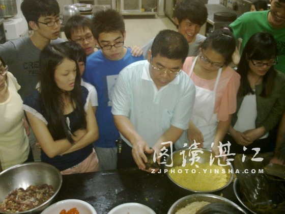 对于大多数学生而言,粽子是吃过,但是却从未亲自动手包过。庞老师教大家做的是咸粽,他首先给大家介绍了咸粽的配方,根据多数人的口味选择了用咸蛋黄,五花肉,瑶柱,虾米和绿豆作配料,可谓用料十足,货真价实。