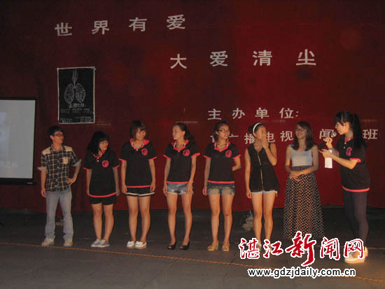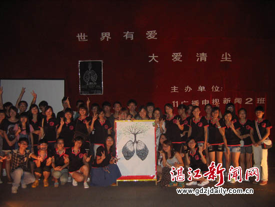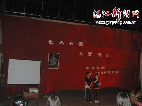 湛江新闻网6月11讯 6月10日晚,人文学院11广电新闻2班在体育馆前举行了以“世界有爱,大爱清尘”为主题的班活动。该项活动以公益宣传晚会的形式展开,目的是让更多人了解“大爱清尘”这个社会公益组织,关爱社会上尘肺病人们。11新闻2班全体同学出席了本次班活动。