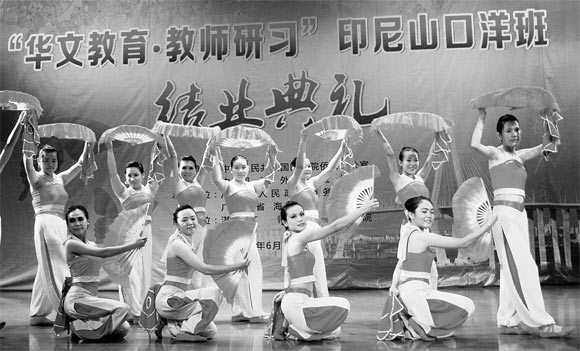 典礼一开始,全场观众一起观看了记录印尼山口洋班在湛学习的DV,回顾了他们3周以来学习和生活的点点滴滴。印尼山口洋地区教师联谊会这次挑选了45名当地青年教师莅湛,进行为期3周的学习交流,其活动涵盖语言、文学、文化、才艺、观摩交流等方面。这也是我国国侨办首次面向一个国家的一个地区所举办的青年华文教师培训班。