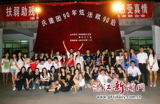 湛江新闻网6月9日讯 为庆祝建团90周年,丰富在校大学生的课余生活。5月25日晚,法政学院学生会文艺部在体育馆前举行了主题为“庆建团90年,炫法政90后”第九届晴天文工团文艺汇演。该院辅导员陈明娟老师、团委主要干部及各二级学院代表参加了本次活动。