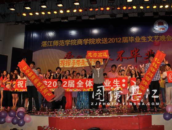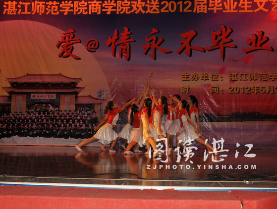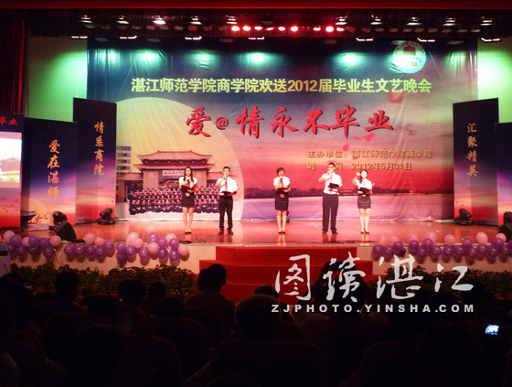 碧海银沙网6月6日讯 5月31日晚,湛江师范学院商学院在音乐厅举行以“爱情永不毕业 ”为主题的欢送2012届毕业生文艺晚会。出席晚会的有学校领导、商学院全体教师、2012届毕业生和毕业生的家长们,部分往届毕业生也专程返校参加了晚会。