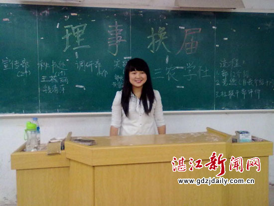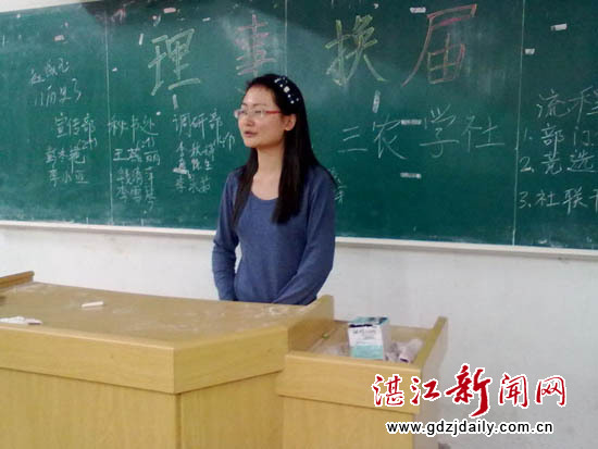 湛江新闻网4月10日讯 4月9日晚,湛江师范学院法政学院三农学社在教三204举行了理事换届大会,社联干部、三农学社的前任会长团应邀出席了本次大会。会议开始之际,是由新任会长龙文飞向学社的成员介绍了各部门的工作情况及招聘的人数,接下来的就是会员和理事协助员精彩的自我介绍和观众的提问环节,应聘者机智的反应及巧妙的回答,使得会场的掌声接连不断。会议最后在社联干部的点评中拉下了帷幕,相信经过新一轮的筛选,新上任的理事将会为三农学社注入一股新的血液,推动社团更好的发展。