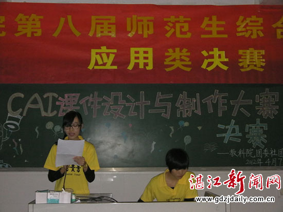 本次比赛是湛师教科院为提高学生运用现代教学技术的基本技能,明确CAI课件的辅助功能,促进学生树立新的教学理念,确立以学生为主体,教师为主导的教学理念,激发制作CAI课件的热情而开展的。在赛前,已经经过初赛的选拔的10组选手已跃跃欲试,运筹帷幄。