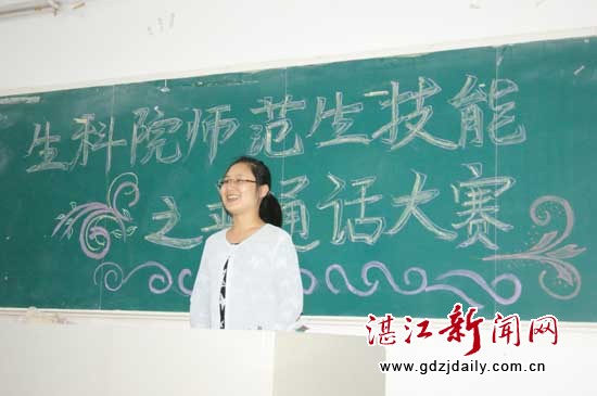 湛江新闻网4月8日讯 2012年4月7日晚7:30,湛江师范学院生科院在教三207教室举行了师范生技能之普通话大赛,院朗诵队队长和过二甲的普通话小老师担任本次大赛的评委,生科院各年级热爱普通话的同学出席了本次大赛。