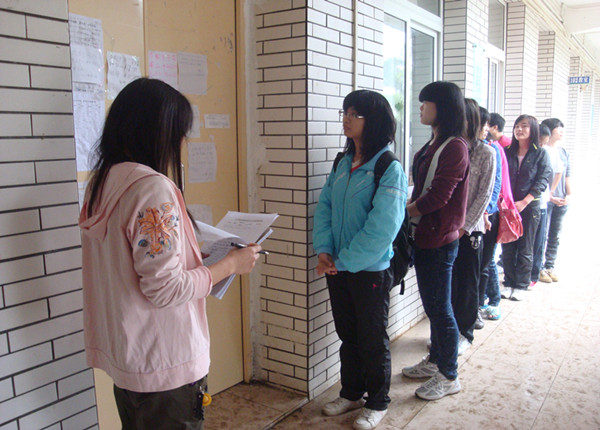 现场,前来面试的同学络绎不绝。其中面试分为自我介绍和回答问题两部分。在一分钟自我介绍里,面试者主要就自身长处和不足等方面做一个简单说明,接着,面试官就时间分配、面试动机和学习成绩等问题对面试人员进行了提问,并令个别面试者当场策划工作方案。面试结束后,中数协会的干部将对高分面试者进行考察,从而根据其表现决定最终录取者,并于近日对外公布结果。