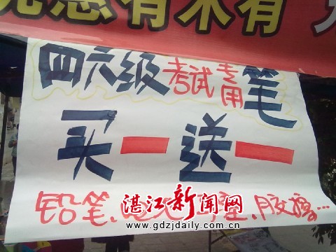 笔者在校园内看到,不少摊点为了吸引学生来购买考试用品,展开了价格大战,如买一送一,购买一支两块钱的黑色签字笔,另外再送一支;如果购买数量多的话,另外再赠送一支,因此也吸引了不少学生前来购买。