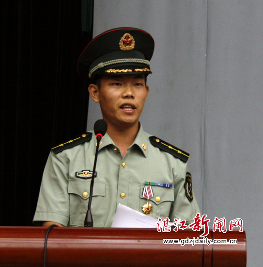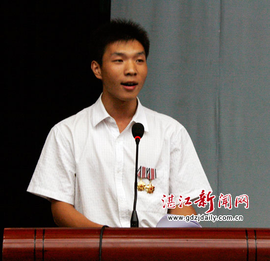 会议在热烈的掌声中拉开了序幕。大学退伍兵、“三等功”荣立者、湛江师范学院大三学生张延文同学首先上台作了报告。他的报告以《军旅生涯谱写青春精神》为主题,回顾了自己两年的精彩军旅历程以及从中学到的点点滴滴。“军营生活给了我一段难忘的青春,当军人的经历让我一辈子都不会觉的遗憾。”张延文如此动情地说道。