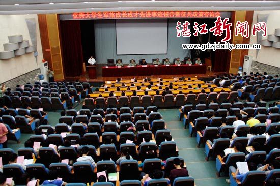 湛江新闻网讯10月28日讯 昨晚7点半,优秀大学生军旅成长成才优秀事迹报告会暨征兵政策咨询会在广东海洋大学主校区多功能室举行。会议由广东海洋大学武装部部长卢俊主持。报告团团长,湛江市征兵办副主任,湛江军分区政治部副主任秦健上校,麻章区人民武装部政治委员吴波上校,广东海洋大学宣传部副部长夏晓明等军区和学校领导参加此次会议。现场各学院数百名学生干部代表热情高涨地倾听了报告会。