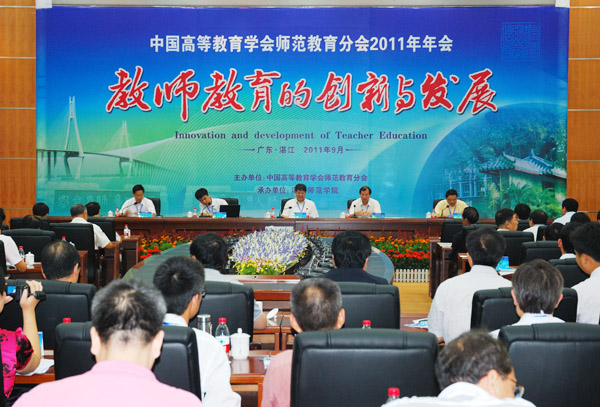 广东省教育厅网10月9日讯 9月27日至29日,中国高等教育学会师范教育分会2011年年会在湛江师范学院召开,来自国内40所师范院校或开展教师教育综合性院校的90余位领导及专家共商教师教育的创新与发展。本次会议由中国高等教育学会师范教育分会主办,湛江师范学院承办。教育部师范教育司办公室陈武主任,广东省教育厅胡振敏副巡视员,中国高等教育学会师范教育分会理事长、华东师范大学俞立中校长出席了会议。会议由师范教育分会秘书长、华东师范大学教科院院长丁钢教授主持。
