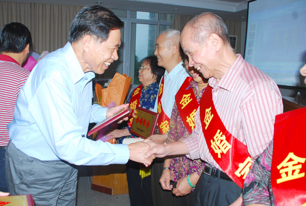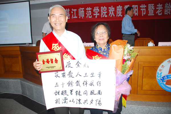 大会上表彰了湛江师范学院老龄工作先进单位、老龄工作先进个人和十佳老人,还对26对身披绶带、手捧鲜花的金婚夫妇颁发了金婚奖牌。为了祝福这些走过50年以上婚姻历程的夫妻,湛江师范学院离退休工作办公室还特意组织他们去照婚纱照,让这些携手走过半个世纪的金婚夫妻在镜头里再次感受幸福。