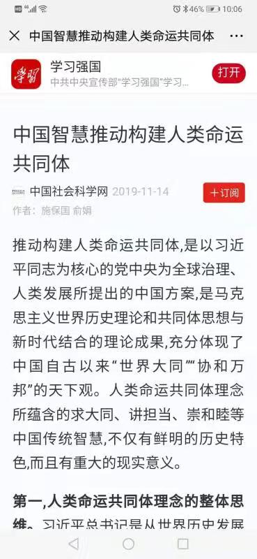 11月14日,以马克思主义学院施保国教授为第一作者撰写的论文《中国智慧推动构建人类命运共同体》在《中国社会科学报》头版发表。该文认为,推动构建人类命运共同体,是以习近平同志为核心的党中央为全球治理、人类发展所提出的中国方案,充分体现了中国自古以来“世界大同”“协和万邦”的天下观。人类命运共同体理念所蕴含的求大同、讲担当、崇和睦等中国传统智慧,不仅有鲜明的历史特色,而且有重大的现实意义。文章围绕人类命运共同体理念的整体思维、人类命运共同体理念的担当情怀和人类命运共同体理念的美好追求等三部分进行阐述。