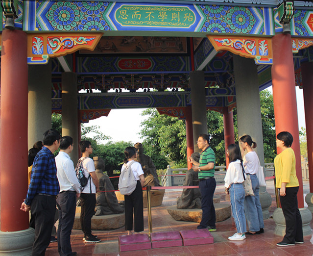 师生党员先后参观了孔子文化城的文津桥、文昌阁、棂星门、孔庙、大成门、大成殿、崇圣池、东西庑、儒学讲堂和杏坛等区域。整个文化城由“孔、古、石、水、绿”五个元素组成,城内的孔子思想文化、儒家历史文化、中国民俗文化、遂溪本土文化俯首皆是,展现得形象生动。从走进文化城开始,师生党员们对中国传统文化博大精深的赞叹声就没有停止过。