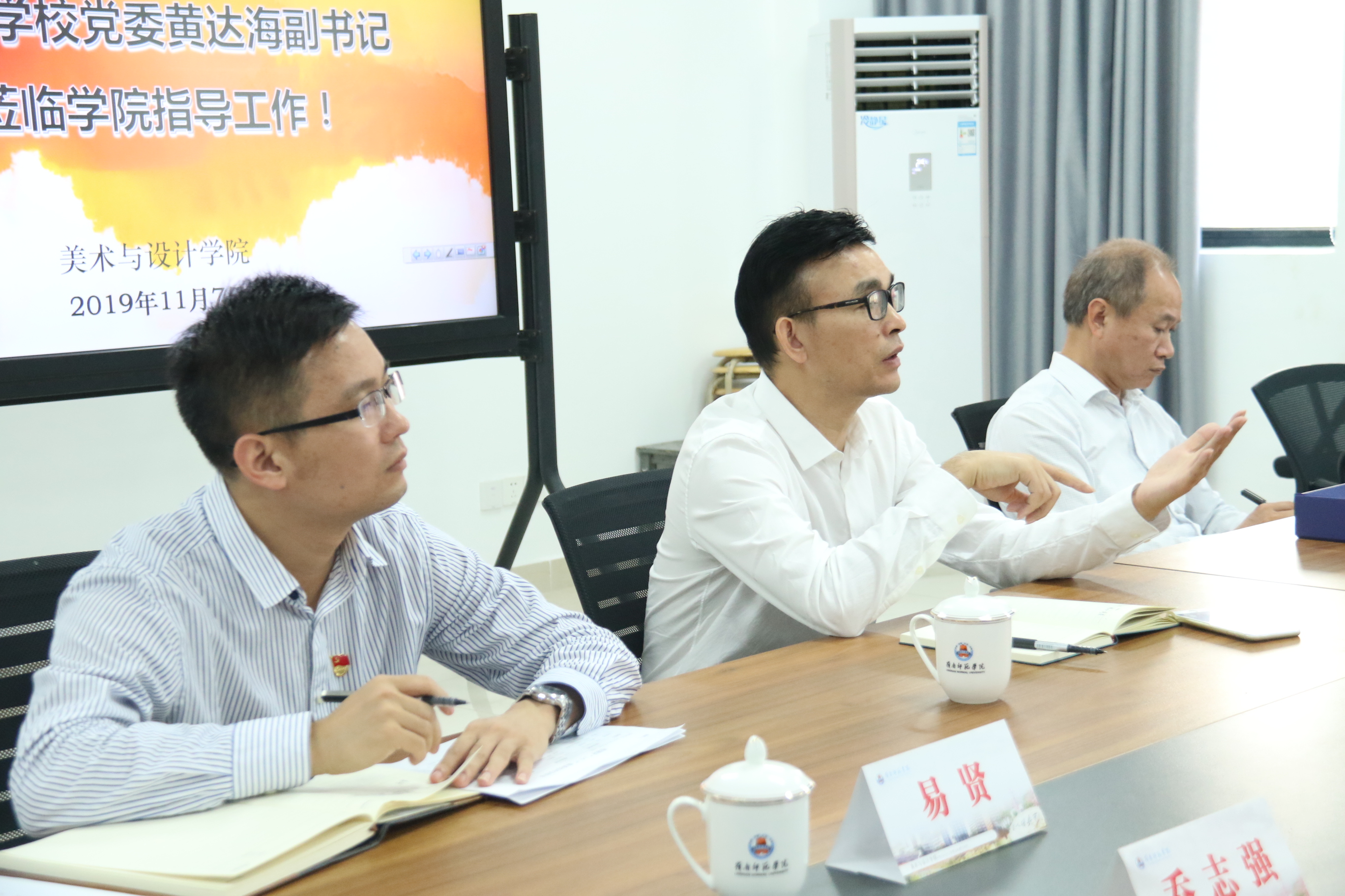 本次由校领导带头,全面加强对基层党支部和普通党员的督导,集中落实“五个联系”工作制度,是开展主题教育工作安排之一。黄达海在听取了美术与设计学院党委李德深副书记主题教育开展情况及相关工作汇报后,黄达海表示,美术与设计学院“不忘初心、牢记使命”主题教育开展的比较扎实,工作思路清晰,进步明显。对学院接下来的“不忘初心、牢记使命”主题教育提出三点要求:一是做好党建和行政工作规范建设,制定相关制度,设立规则,进行规范化管理,推进学院学科专业建设;二是“不忘初心、牢记使命”主题教育要推动调研走深走实,就要从检视问题入手,在找准差距、剖析根源上下功夫,不断补充完善检视问题清单,推动检视问题持续向深处、实处和广处拓展,破解学院发展遭遇的瓶颈问题,提升学院建设水平;三是以其联系的美术与设计学院教工第二党支部即设计系党支部作为学校样板党支部来创建。黄达海对设计系党支部主题教育工作开展表示肯定,要求设计系党支部李强书记再接再厉,通过增强基层党支部的建设为切入点,以党建引领专业建设,解决党建与业务工作两张皮问题。通过充分发挥党支部和党员的“头雁”作用,以党建推进设计系三个专业的建设上一个新台阶。