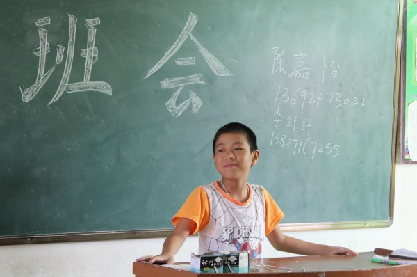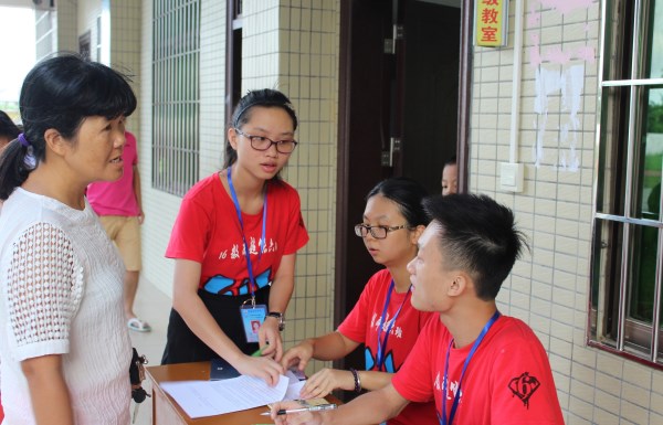 班会前,同学们在家长的陪同下陆陆续续地进入教室,家长在教室门口向实践队队员们询问自己小孩所在班级的情况。
