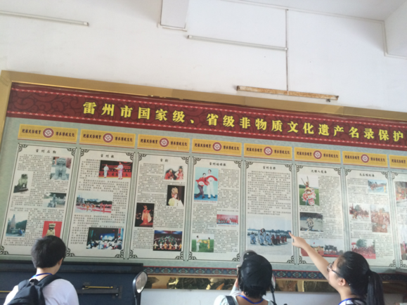 队员们来到雷州市文化馆进行参观,在陈列室欣赏以及了解雷州民歌和当地文化。接着队员们有幸与黄新馆长谈话,黄新馆长对雷州民歌有一定的研究,曾获得“雷歌状元”的称号。在与黄馆长的谈话中,队员们了解到雷州民歌分为三部分:雷州歌,姑娘歌以及雷州歌剧。黄馆长分别讲述其历史以及发展,在讲述的过程中雷州歌脱口而出,提高队员们对雷州歌的兴趣。雷州民谣作为非物质文化遗产,发展至今已有衰退之势,黄馆长指出:现如今的青少年对雷州民歌并不熟悉,但对八十年代之前的前辈们来说,雷州民歌依旧是他们生活的娱乐方式之一。黄馆长还提出会加大对雷州民歌的宣传力度,以家庭教育、学校宣传和开展活动等方式去传承雷州民歌。最后,黄馆长为队员们提供《黄新雷歌作品集》和《雷州歌大典》等宝贵资料,为队员们的调研给予有效性帮助。