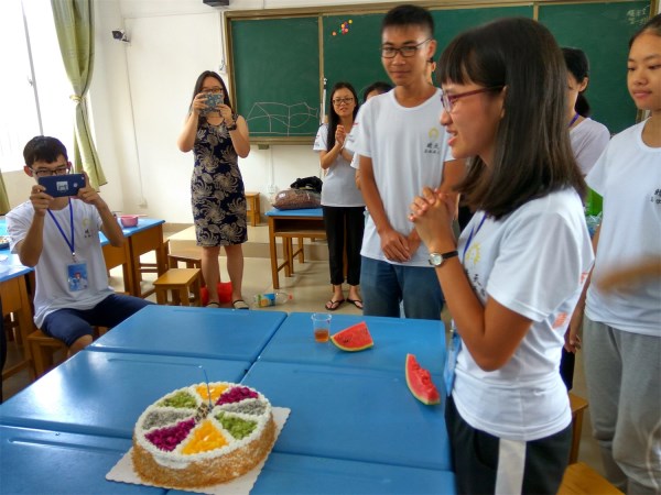 邸老师与实践队员亲切交谈,向队伍赠送慰问品。邸老师从交谈中了解到队员生活的囧人囧事,氛围轻松有趣。队员们盛情邀请邸老师共进午餐。午餐后,“晴天”社会实践队迎来了今天最温馨的时光。老师和全体队员唱起了生日歌,为队员潘晴带来了生日惊喜。在小寿星许愿、切蛋糕后,队员们打打闹闹,互抹蛋糕,玩得乐不可支。