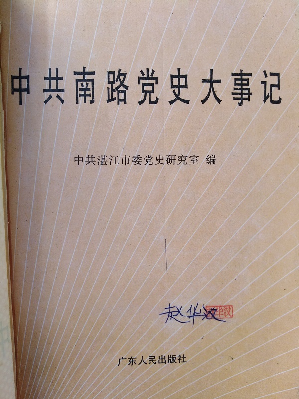 在即将结束问卷的时候,赵老人说,他已经老了,他的记忆力已经不好了,他尽力的把当时革命的事情都告诉我们,不多说一个字,不说少一个字,希望这段历史被如实记录下来。并且赵老人把当时有关南路革命的书籍找出来,交给我们队伍看,那本被保存的完好的书籍,扑面而来的历史感,让实践队队伍感触颇多。赵老人在队伍离开的时候,表达了对调研组的感谢,并嘱咐我们后人好好学习,将来为人民服务。