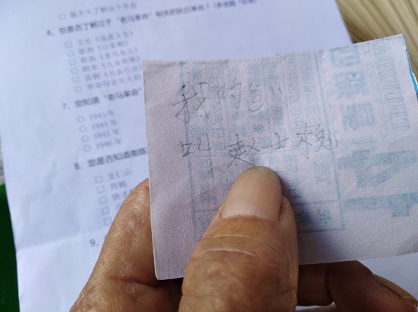 在调研过程中,寻骥实践队伍在进行问卷调查的过程中采访到一个革命老人。老人名叫赵华汉,今年91岁,在老马革命的时期,他与他的父亲都在当时的兵工厂工作,他们主要负责制造子弹、地雷、枪械等武器。在那个战火纷飞、物资匮乏的年代,老人始终坚持相信着,共产党会带领大家取得战争的胜利,他们每一位都兢兢业业的在自己的岗位上,认真负责的为解放战争而奋斗。