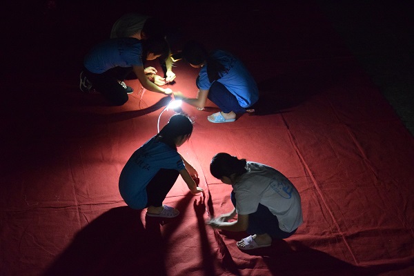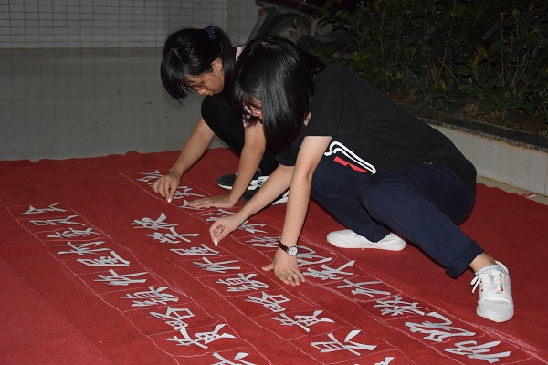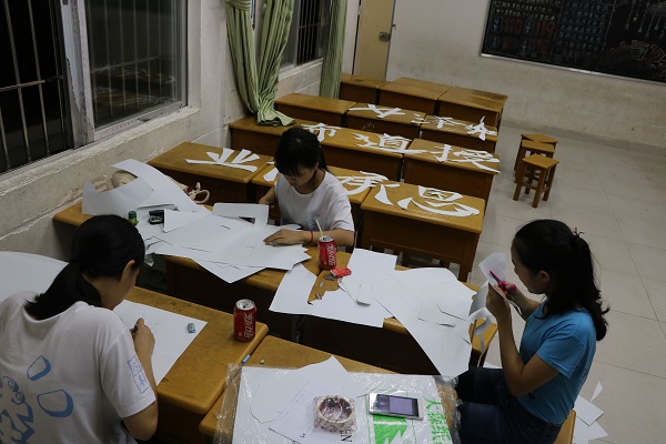 在该队队长温丽怡合理的工作安排下,该队全体队员和学生们的密切协作配合下,该队准备工作顺利进行着,准备工作包括节目、服装、幕后等方面。在节目方面,每个节目的负责老师都在抓紧时间排练,把每位学生的每个动作都一一指正,学生们也都十分认真地学习着,尽管是他们第一次接触的东西,他们都能以高度集中的学习态度来学习;在服装方面,该队队员们都能积极主动的参与其中,不顾白天的劳累,在傍晚吃过晚餐之后,都在教室内一起为文艺晚会的环保时装秀制作服装;在幕后方面,所有队员都在参与幕布的制作当中,包括缝制、剪字、贴字、悬挂等。