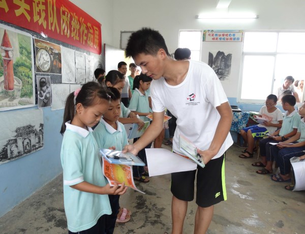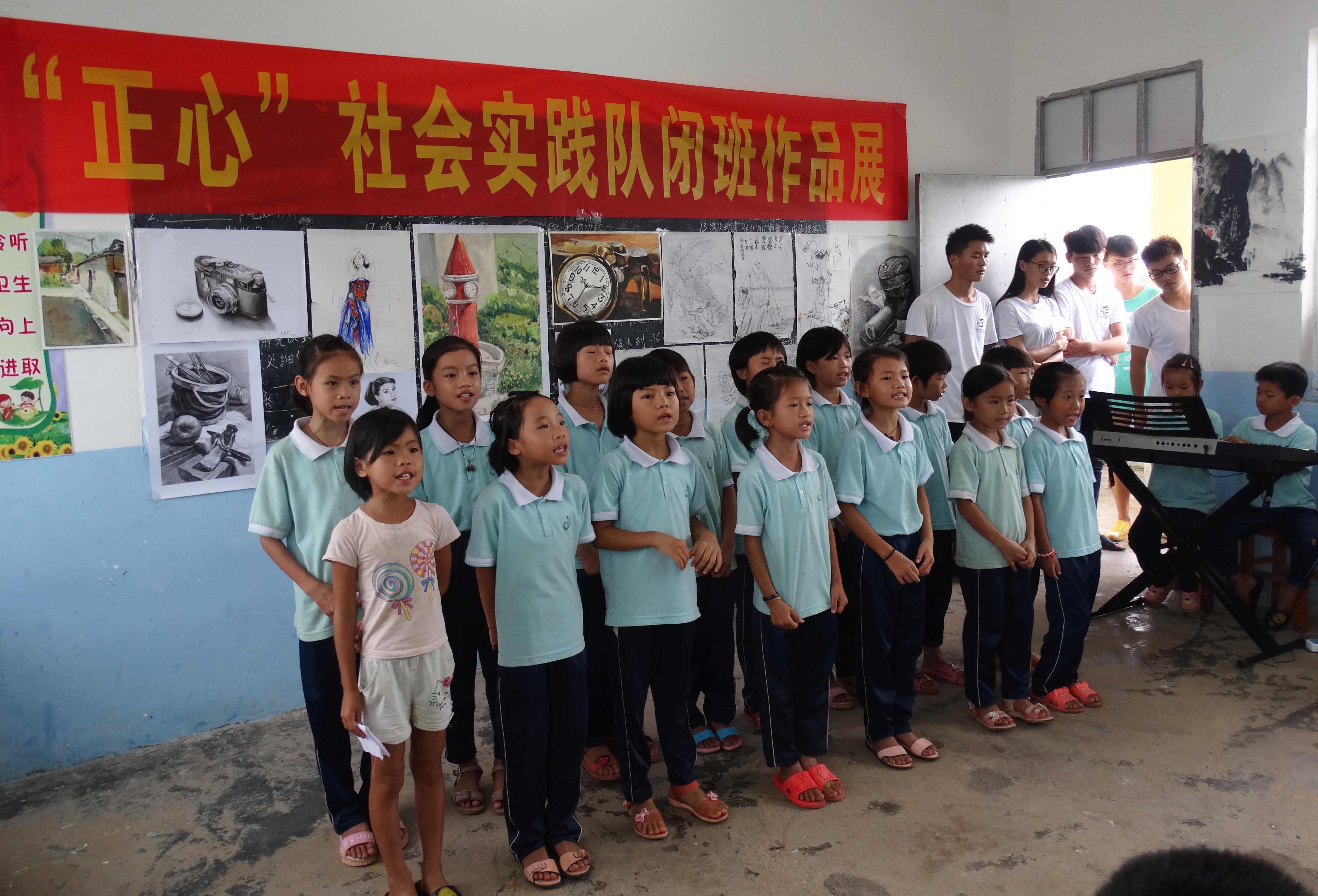 “正心”社会实践队队长上台发言,她说:“非常感谢三塘小学为我们提供了这样一个实践基地,也非常感谢在座的小朋友们配合我们实践队完成了此次实践活动,同时我也由衷地感谢“正心”社会实践队其他23名队员,在这十天里我们队员团结协作,共同完成了任务……”讲话完毕后,队员们拿出早已准备好的奖状和奖品并由校长颁发给在书法课和绘画课上表现优秀的学生。颁完优秀奖以后,队员们也给在场的小学生都颁发了学习用具,拿到奖品后的学生们都欢呼雀跃,看着他们兴奋的表情,支教小老师们都倍感欣慰。
