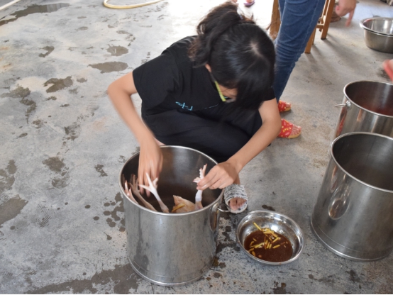 在此过程中,出现了一个小插曲--副组长把醋当做酒倒入锅中,一股酸流弥漫空中,在得知这个小意外后,后勤组的组员们在闷热的厨房开怀大笑。在这个狭小的空间里,记者见识了后勤组长的刀工,一阵刀声过后,五碟鸡肉已经摆好,金黄黄的颜色让人垂涎欲滴。