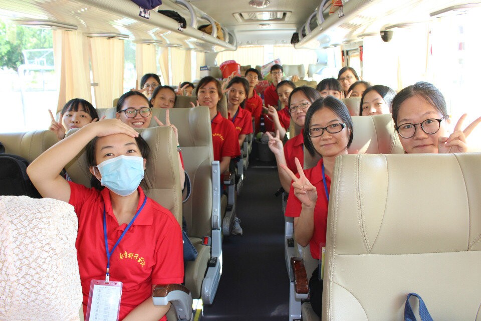 集结在第四教学楼的楼下,蒲公英队员们统一穿上代表着热情的红色的院服,带上自己的行李,向着支教地点——白沙二中,出发了。