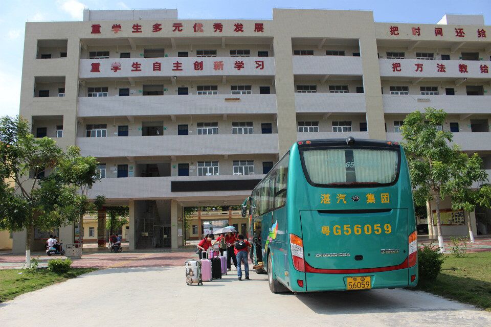 经过约两个小时的车程,队伍来到了雷州白沙二中。一进大门的左手边就看见两个篮球场,车再往里面开一些,就看见一栋教学楼,食堂和宿舍分布在右手边。这里绿树环绕,空气清新,天空也蓝得很漂亮。