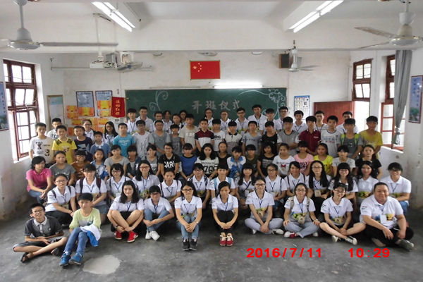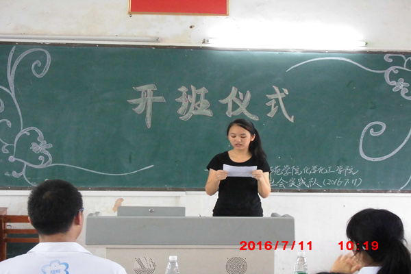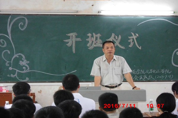 7月11日上午,化学院“熠辉”社会实践队在高州市平山第一中学初一(3)班教室举行开班仪式会议。参加本次开班仪式的有该校领导黄主任,“熠辉”社会实践队全体队员以及参加本次暑期在校社会实践的学生。现场气氛热烈,学生积极配合队员,认真聆听领导、队员的讲话。