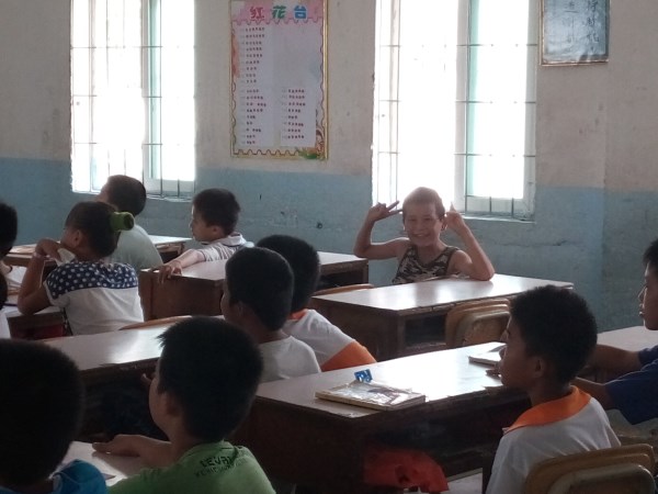 “我在教室后面拍照时,他刚好转过头来,我就示意他做耶的手势,他就笑得很开心。”红土情缘社会实践队五一班的班主任刘映宇翻出她拍的那张照片,指着照片中一个冲着镜头摆着剪刀手,笑得开心的孩子。