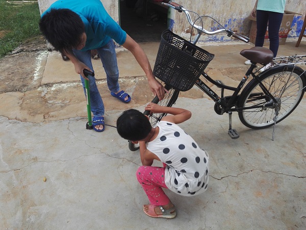 晓清同学发现这里的一辆自行车没有了气,于是就有同学把打气筒拿出来。一位小朋友,原本在骑着单车,看到有人在为自行车打气,便在不远处把车子慢了下来,快到这里时,停了车。二话不说就把手放到满是泥巴轮胎那里捏一捏,看看够不够气。快够了的时候,她就抬头看着我们。就这样,我们在默默无语中,完成了一次合作。后来我们问她叫什么名字,在哪个班。突然想到,这就是那个之前大家放学把学生送走了,又骑着自行车回来的小女孩啊。早上也是她最早骑着车过来,在校园里,她时而骑着车,时而走在我们靠近宿舍的树边,看着我们说笑打闹,可我们却从来没有注意过她,而她也从来都是在我们需要帮助的时候直接过来帮忙。