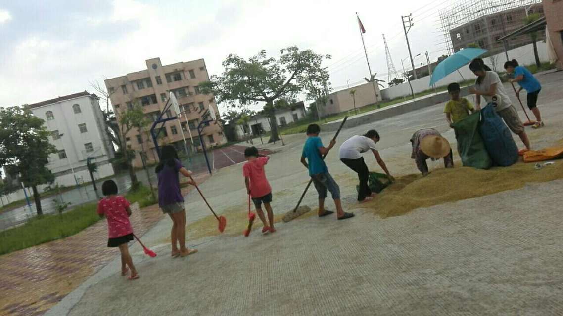 “下雨了,快收队服。”不远处传来队员的声音。季夏正值小暑、大暑时节,暴雨也就时常光顾大部分地区。一直窝在办公室写稿的我闻声便起身向外走去。一幅温馨的画面吸引了我的眼球,便把收队服的事儿抛在脑后了。在操场那边,队员在帮村民收拾稻谷,还有正从不远处赶过来帮忙的队员。雨水却无视我们的担忧与真情,使劲儿地滴落大豆颗般的雨滴。老人和小孩更加麻利起来了。老人一直弯着腰,熟练地把稻谷装进麻袋。跟小孩比起来,队员就显得有些生手了。你看,小孩虽然没扬扦高,但一看就知道肯定干过几年农活。他们熟练的身手在雨水的笼罩下显得更加令人心疼。