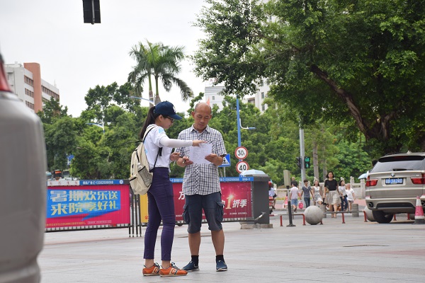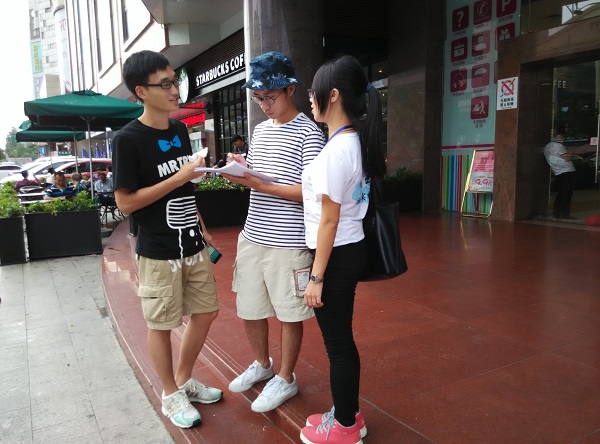到达国贸大厦后,队员们马上投入到工作中。经过两天的工作后,队员们都熟悉了怎样去请路人们填写问卷,虽然仍然会有少数的路人拒绝,但是大部分的人还是很乐意的。特别是知道这是来自岭南师范学院的三下乡调研工作后,很多路人会很热心地给予队员们更多的建议。就如今天,一位店主除了认真填写了问卷外,还跟队员们谈到了他对出境游的经历和国人在国外旅游的素质。他说道,在国外旅游,国人的素质还是很不错的,只是新闻媒体往往报导的国人在外国旅游素质低是极个别的案例。他认为,现在旅游业应改善的是对国内景点的改善,提高国人对自己国家内景区的爱护意识。“听君一席话,胜读十年书”队员们从这位店主口中收获了很多,针对这位店主的看法,队员将于晚上开会研讨。