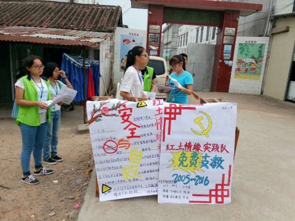 据笔者了解,红土情缘社会实践队为了响应国家“科技、文化、卫生”三下乡的号召,围绕“安全”、“科技”、“当地历史”、“心理健康”、“爱国”五个主题分别绘制海报,进行海报宣传活动。
