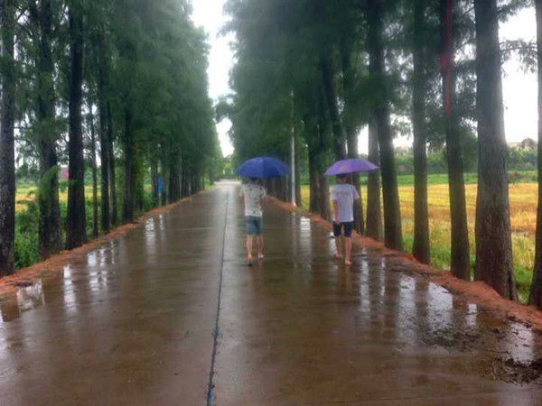 午休过后,天边飘来了几朵乌云,渐渐地沾染了苍穹。雨滴慢慢地连成线,从天的尽头铺满了整个天地。后勤组的队员打着伞,冒着雨,为了全体队员的伙食而奔波。一朵朵伞花开在乡间的小路上,雨滴落在伞上汇成一曲大自然谱的优美乐章。