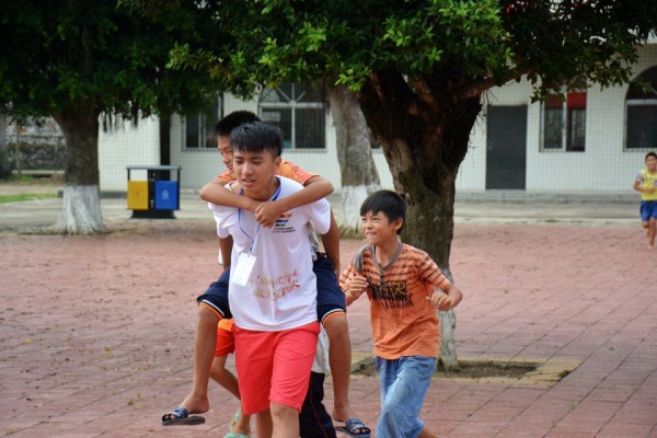 我所属的四年级班的同学们无论是在课室还是在操场,当我从宿舍走出来时,四年级的小朋友有的跑过来牵着我的手,有的擎着我的衣服。仿佛我是他们的家长,是他们强而有力的保护伞。此刻,我心中不禁感动而且有一丝悲凉:作为留守儿童的他们太需要别人的关心和爱护,他们太久没有过被人保护的感觉。所以我们更需要在短短的十天支教活动中给予小朋友们更多的关怀,尽管小朋友有淘气的现象,但是我批评他们却也于心不忍,因此总会用委婉的语气跟他们讲道理。他们总能乖巧地答应我不调皮,听话。