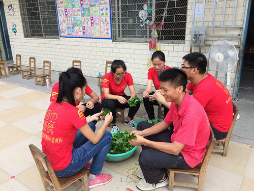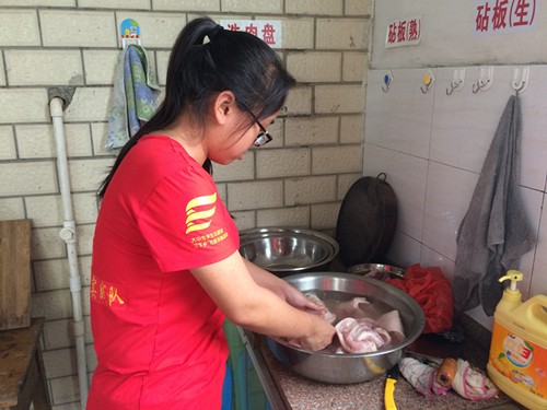 下午做饭,我们三点便开始开工,可是由于下午的菜式很多材料都要切成丁,于是我们便马不停蹄地切切切,剁剁剁的切菜声不绝于耳,如同大珠小珠落玉盘,嘈嘈切切错杂弹,别有一番在音乐厅里听不到的音乐美感。耗了一个多小时的功夫我们才把材料处理好,抹一把汗,看着虽然切的大小不相同但丢在一起可爱的如同彩色宝石的菜丁肉丁就无比的欣喜骄傲。做完饭菜,便要分饭菜,起先我们都不敢分太多,小心翼翼地掂量着,可没想到,分太少了,于是小伙伴们就接着开始分第二轮,哎呀,可是没想到还是剩很多啊。一小伙伴便自嘲道:“缺少经验啊,哈哈哈——”我们也不禁跟着笑了起来。