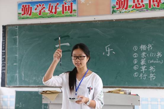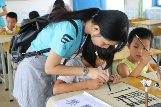 早上8点30分,晨曦的睡意伴着雨露的潮湿和泥土的气息渐渐褪去,夏季清新微凉的晨风吹拂发梢,沁人心脾,离第一节课上课时间还有5分钟,此时的我站在了五年级一班的教室外。外面,阳光正好,夏意醉人。8点25分,我带着书法教材和工具从容地走进教室,从孩子们兴奋的惊叹声中我感受到他们的期待,这笔墨纸砚到底是一个怎样的全新世界?在其他同伴的帮忙下,我们顺利把工具分发完毕,准备工作就绪,我的小小书法班正式开班。我从小游戏入手,让他们猜测教材中的作品属于哪种字体,他们明显地表现出对这些字体很感兴趣,大胆地说出了自己猜测的答案,孩子们在游戏中了解到书法的基本字体及其特点,在楷书,隶书,篆书,草书,行书中感受到书法文化视觉独特的美的感受。