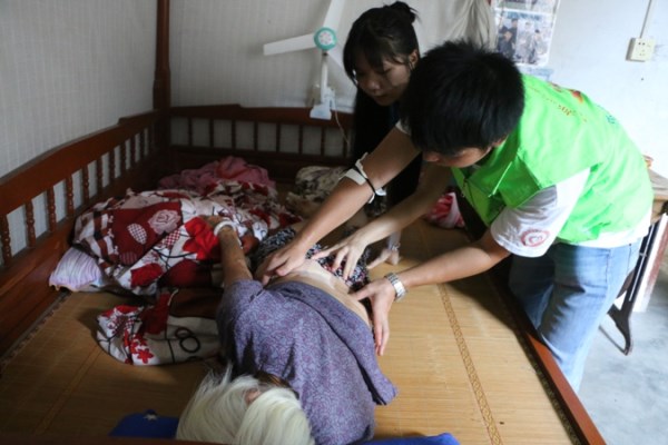 老人和我们聊得十分的投契,现场的氛围也格外的活跃,聊着聊着,广医的队员早已拿出血压测量计,老人也下意识地卷起袖子,看着那皮包骨似的,细的令人心疼的手臂,负责义诊的队友注视着测量仪后,面对着老人地不禁开口:“阿婆,太瘦了。要多吃点啊。最近有没有胃口啊?要吃得平淡点,不要吃得那么咸。有空多去村委的医疗站量量血压,注意自己的身体……”老人没有体检的习惯,直到听到自己有高血压的迹象,老人先是愣了一下,随后说她日后多去村的卫生站检查,并对队员的义诊表示感谢。听完这样的话,自然我们也就放心多了。后来,又得知老人有腰肌劳损的毛病,我们的队员主动为老人按摩穴位……
