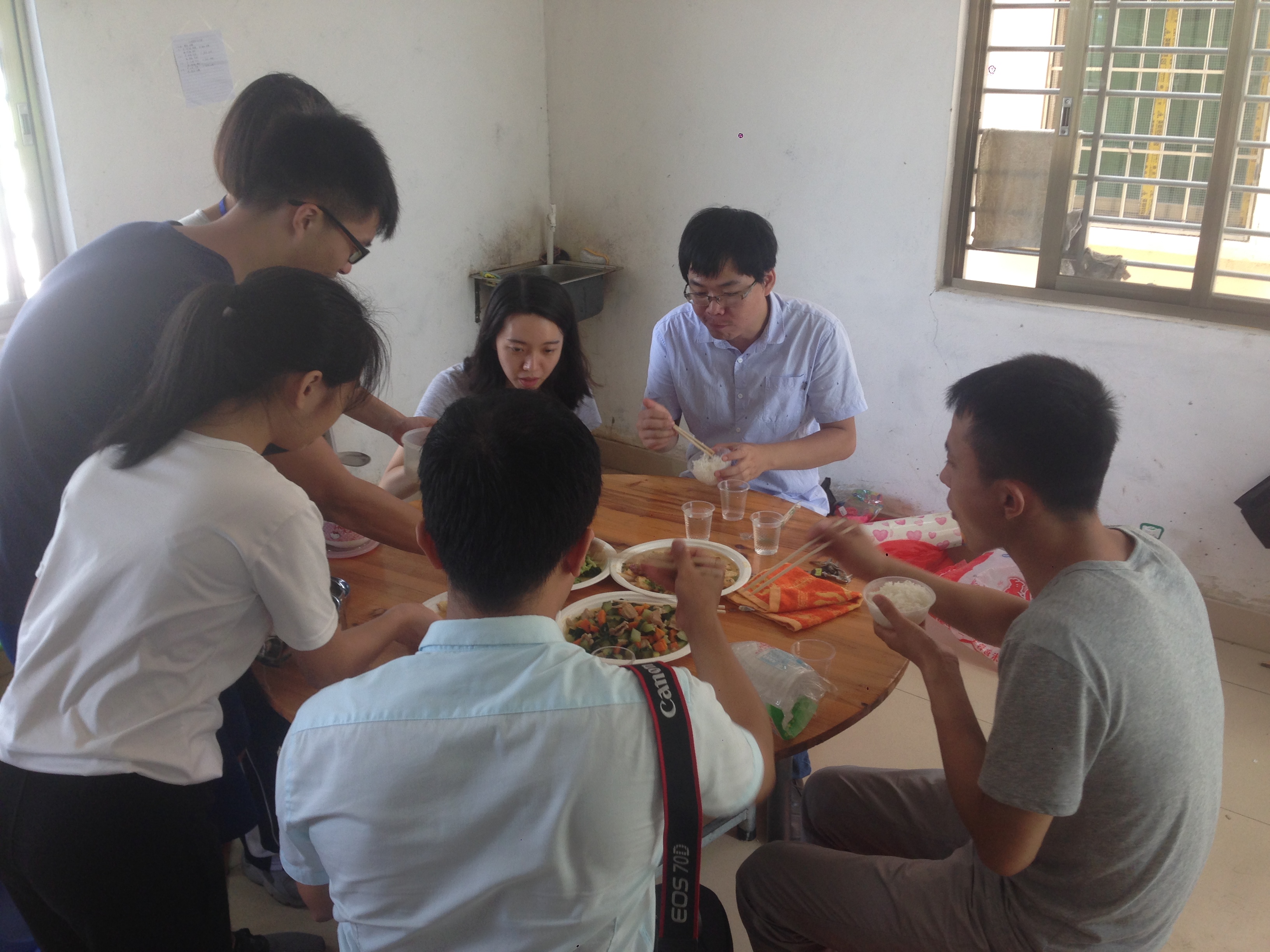 为了更好的贴近三下乡队员们的生活,四位辅导员老师还留下与队员们共进午餐。老师们纷纷称赞实践队队员的厨艺,充分肯定了后勤组队员的努力。餐桌上,大家都其乐融融,欢声笑语。临近探访结束,辅导员和队员们一起合影留念,并勉励大家要继续努力,发扬岭师学子的团结拼搏、开拓进取的精神。
