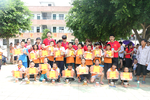 临近中午,游园活动接近尾声。最后的领奖环节,孩子们凭着玩游戏赢来的印章排队领奖。不同的印章数会有不一样的奖品,印章数最多的可以获得一等奖:一罐精致的糖果和一本漂亮的笔记本。这些奖品都是红土情缘实践队的外联组辛苦到城市联系上的赞助商赞助的,包含了他们对孩子们深切关怀。每一个在场的孩子都领到了奖品,这些孩子们捧着领来的奖品,黝黑的小脸上绽放出纯洁美丽的笑容。陪同的家长们也很满意欣慰。