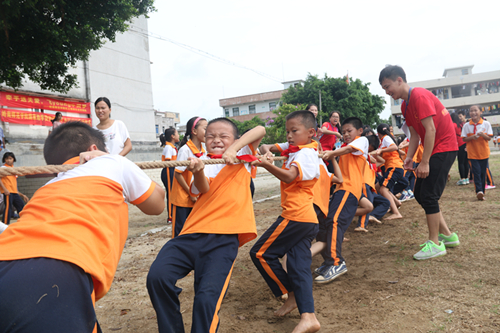 最吸引人的拔河比赛也紧锣密鼓地开展起来。孩子们准备就绪,分为两队站好。他们的小手紧紧地握着绳子,炯炯有神的大眼睛牢牢地盯着裁判员,耳朵灵敏地竖起来,仿佛等裁判一声令下,就会像一支离弦的箭一般窜出去。全场的气氛都凝固着,这时,裁判尖锐的哨声突然点燃了火药桶,全场一下子燃了起来。孩子们咬紧牙关,憋红了小脸,使出全身的气力往后拉,家长们在一旁使劲地加油,恨不得能亲自上前帮孩子一拉把,打气声充斥了操场的每一个角落。