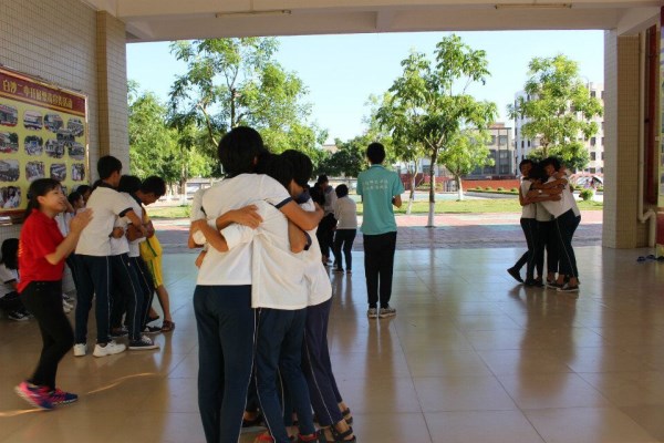 在班主任的带队下,各班都有序准时到达活动场地。首先学生以班主任为中心围成个大圈,班主任开始讲解第一个热身活动——爱的抱抱。游戏中,学生听到口令后和同性同伴紧紧抱在一起,有的被同伴抛弃了而淘汰掉。两轮下来,让学生感受与自己爱的人肢体亲密接触的重要性。在生活中,对待同学、朋友、父母等比较亲密的人,我们要及时地紧紧抱着他,不能忽视他们,要及时回应、热情相待。不要等到时光没有了就后悔。
