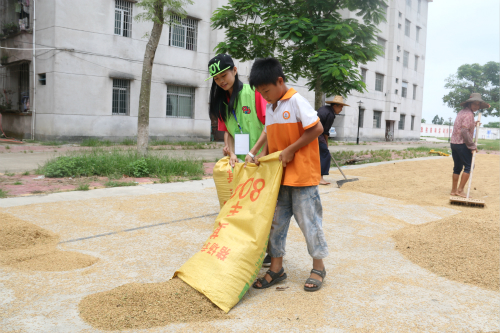 正午烈日下,在晒谷空地附近旁观的孩子也被志愿者们挥汗如雨的形象感染了,纷纷离开树荫,加入晒谷的行列。志愿者们借机“灌输”孩子们助人为乐、自强不息的思想教育,“言传”和“身教”双管齐下。