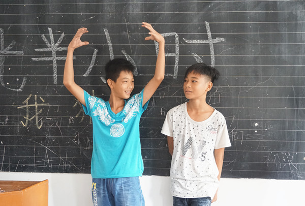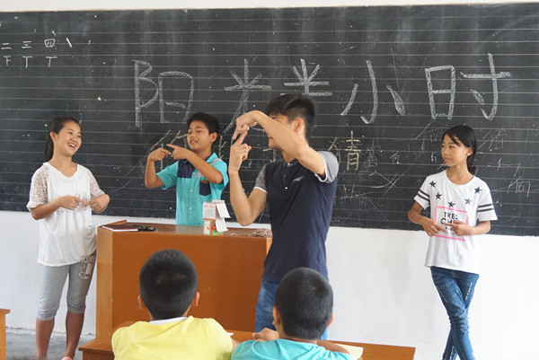 “一日之计在于晨”。“乐事”社会实践队举办的特色活动“阳光半小时”已经开始了。今天的“阳光半小时”的内容是“你比我猜”的游戏。支教组的老师在讲台上拿出纸片,介绍游戏规则,由在讲台上的学生表演动作,台下的学生来猜。游戏开始了,小学生迫不及待的举手,他们都想上去玩。老师只能选举手快的同学上讲台玩。同学们卖力的表演,用略带害羞、笨拙的动作、天真可爱的表情,展现了他们孩子的天性。台下的学生哈哈大笑,气氛活跃。在抢答环节,就由老师表演动作,同学们来猜并抢答。老师夸张的表演让同学们忍俊不禁,现场气氛激烈,整个教室充满着欢笑声。