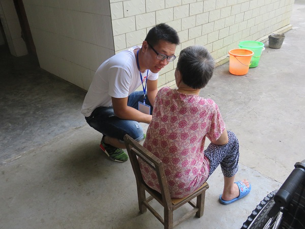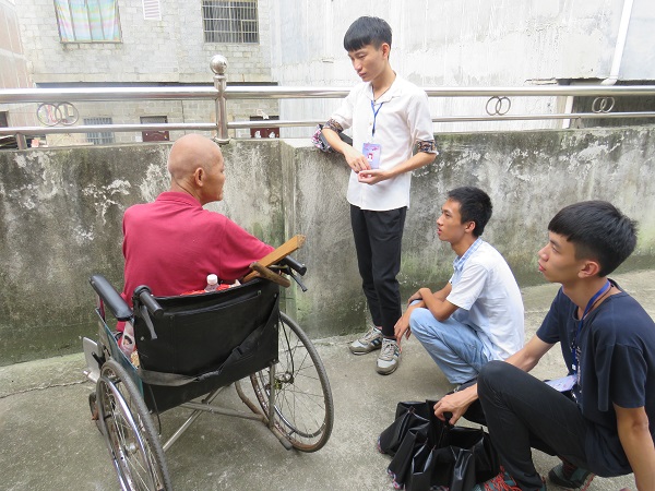 八点四十五分,队员们时抵达敬老山莊,使得原本冷清的敬老山莊热闹了起来,山莊的爷爷奶奶看到有人来探望都显得非常高兴。随后队员们都热情地与爷爷奶奶交谈起来,虽然在交流过程中出现了语言障碍,但是队员们还是积极地与他们交谈,努力、用心地去理解,看着他们沧桑的脸上都出了笑容,队员们亦露出了暖暖的笑容。