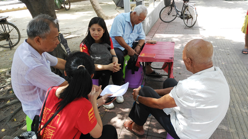 我们预想一般都会有一些老党员会在图书馆看书或报纸,但是理想是丰满的,现实是骨感的,这一天图书馆不开门,我们只好转战另一个战场——我们来到了遂城影剧院那里,树荫下面有很多中老年人在那里乘凉。我们就在那里遇到了好几个党员,他们都很积极回答我们的问题。