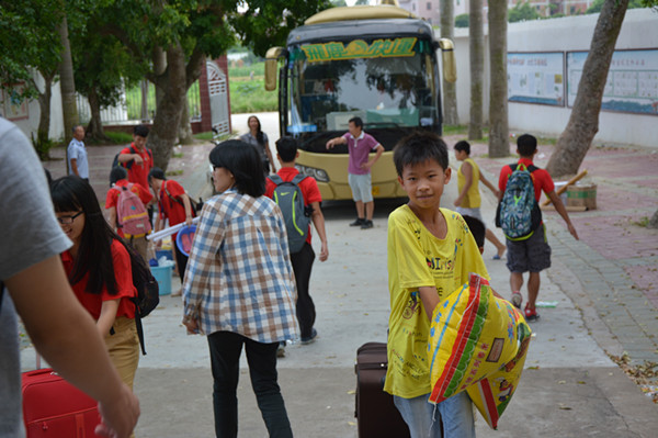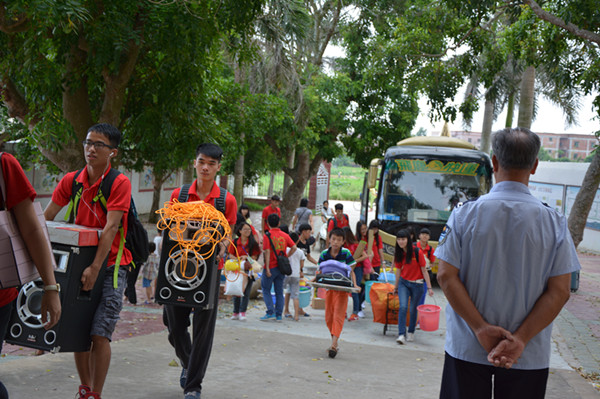 车刚刚停稳,蒲公英社会实践队队员们就迫不及待地从车上下来,看看这个熟悉的可爱的地方的新模样。我看到一张张好奇地张望着的面孔,一个个单纯的模样,好像等待了好久,又好像在期待着什么……等到队员们把行李搬下来,那些孩子再也按捺不住激动的心情,一个个不亦乐乎地帮忙把行李搬下去,队伍瞬间成了接龙,行李就在那一双双大手小手间传递着,甚至一个瘦小的男孩搬起了一袋大米,高兴地奔向学校大门。这个场景,无论谁看见了都会为之感动。那么一个瘦小黝黑的身体,竟然可以承受惊人的重量。