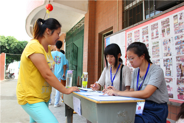 经过昨天的宣传,今天一整天都陆续有家长带领孩子来学校报名。早上7点,队员们就已经做好准备,接待前来报名的家长!或许正如那话“梦想是美好的,现实是骨感的”,队员们并没有实现之前那天真的想法——校门外拥挤着一大批来报名的人。现实在跟队员们开玩笑,前来报名的都是陆陆续续地来,而且直到傍晚还是有家长带着孩子过来报名免费补习。不过,这已经让队员们很欣慰了,负责招生的队员们放弃午睡时间守候着报名大本营并积极地为前来的家长排忧解惑!