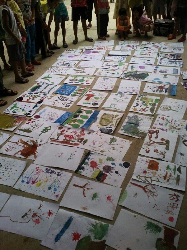小孩子的想象力是最丰富的。有的孩子把颜料蘸在画纸上,用吸管吹出形态各异的形状——方形的太阳,圆形的房子等;还有些孩子以手掌为画笔,沾上颜料,在纸上印出各种图案。在旁的实践队队员就帮助低年级的学生弄好颜料并且解答他们的疑惑。在大树下,孩子们画得越来越娴熟,一个个化身抽象派大师,意象派大师,超写实主义大师。全校70多个学生,都用一纸,一笔,一手,作出五彩画廊。